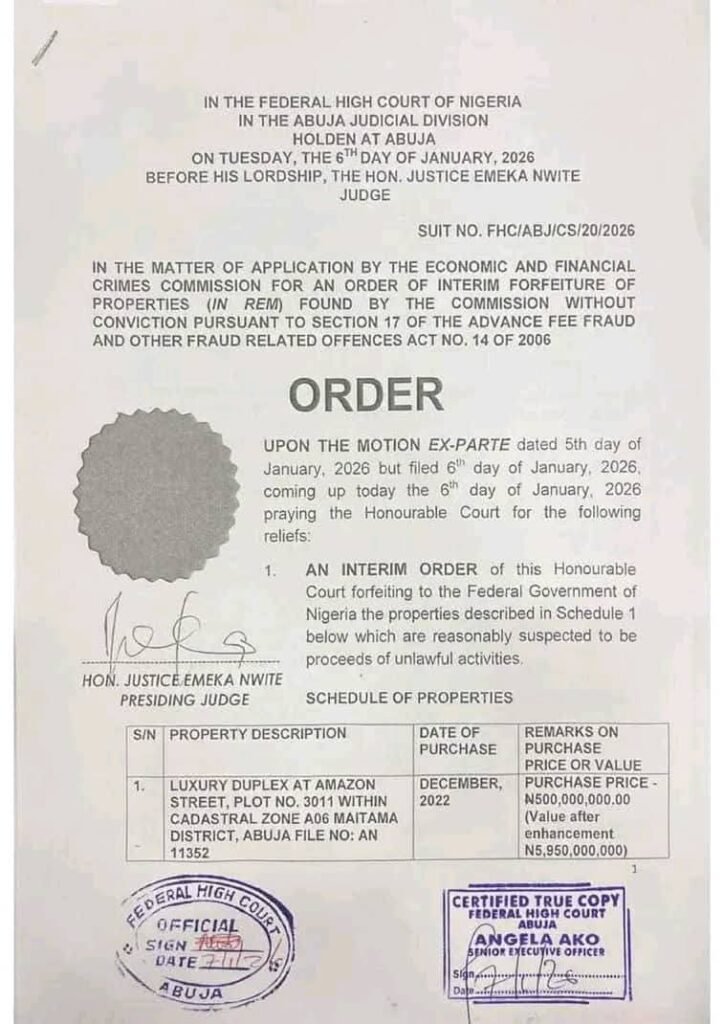 In granting the order, Justice Nwite ruled that, “It is hereby ordered that an interim order of this honourable court is hereby made forfeiting to the Federal Government of Nigeria the properties described in Schedule 1 below which are reasonably suspected to be proceeds of unlawful activities”
