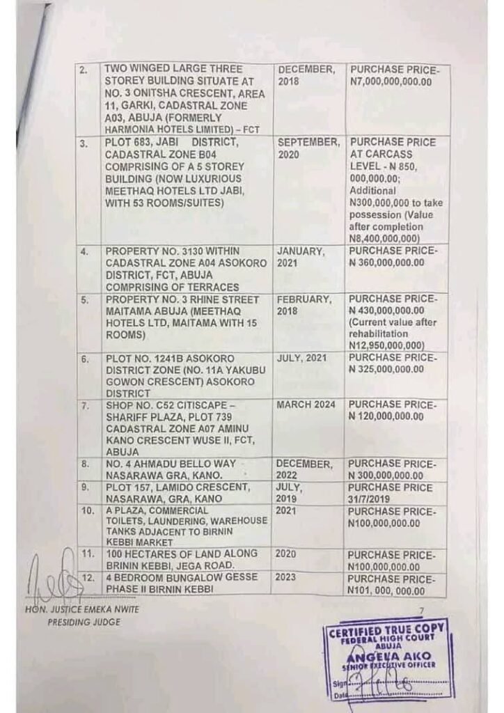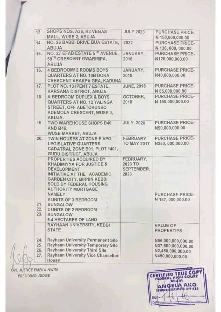 The multi-billion naira landed properties , valued at N213,234,120,000 are located in Abuja, Kebbi, Kano, and Kaduna States.