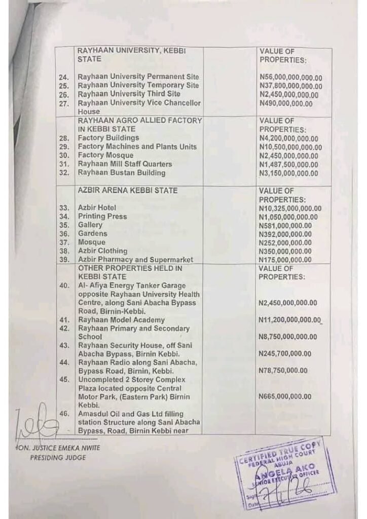 The properties include: Rayhaan University Buildings, Agro allied factory buildings, machines, hotels, pharmacy, supermarket, primary and secondary schools, oil and gas filling stations, shops and other buildings.