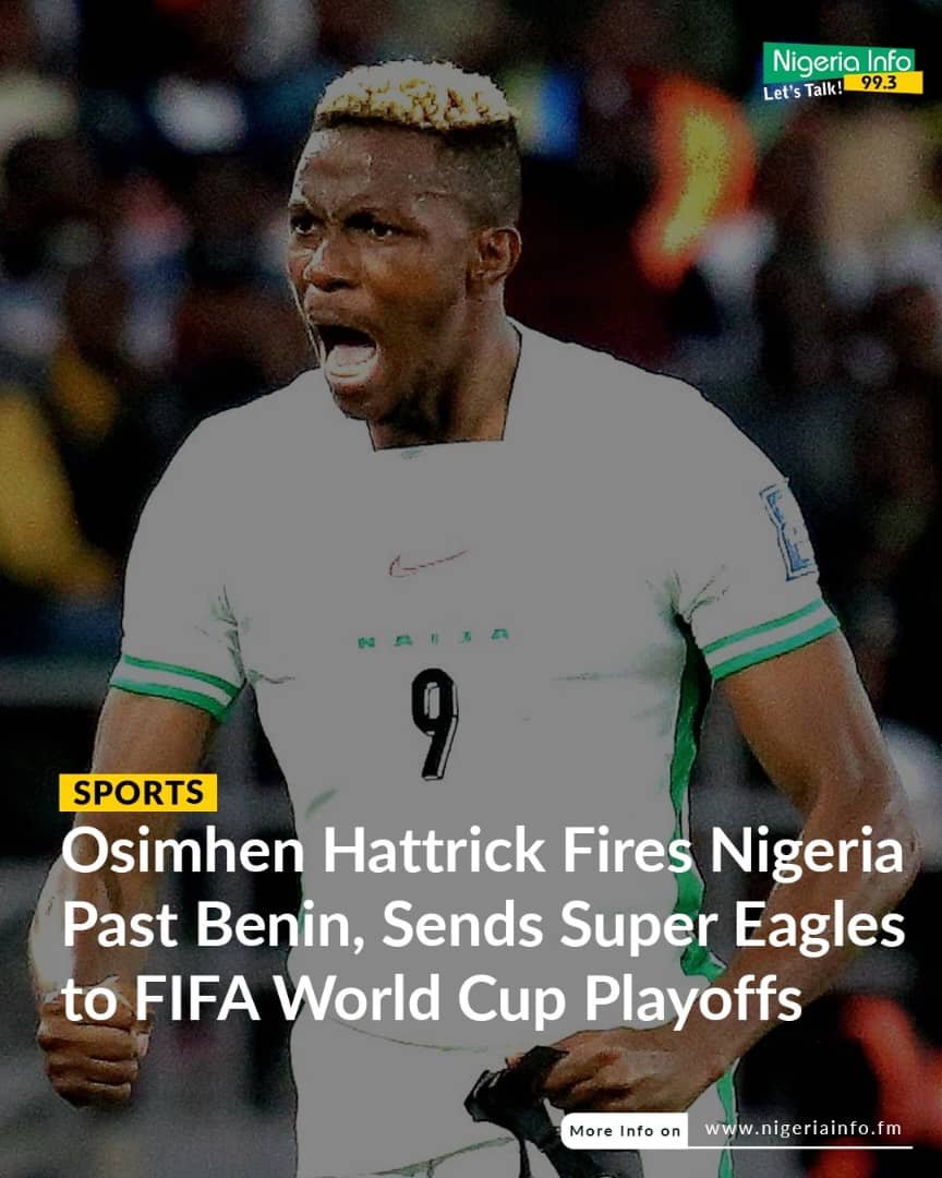 A hattrick from striker Victor Osimhen and a 90th minute goal from Frank Onyeka saw Nigeria’s Super Eagles beat Benin Republic 4-0 to book a place in the playoffs for the FIFA 2026 World Cup.
